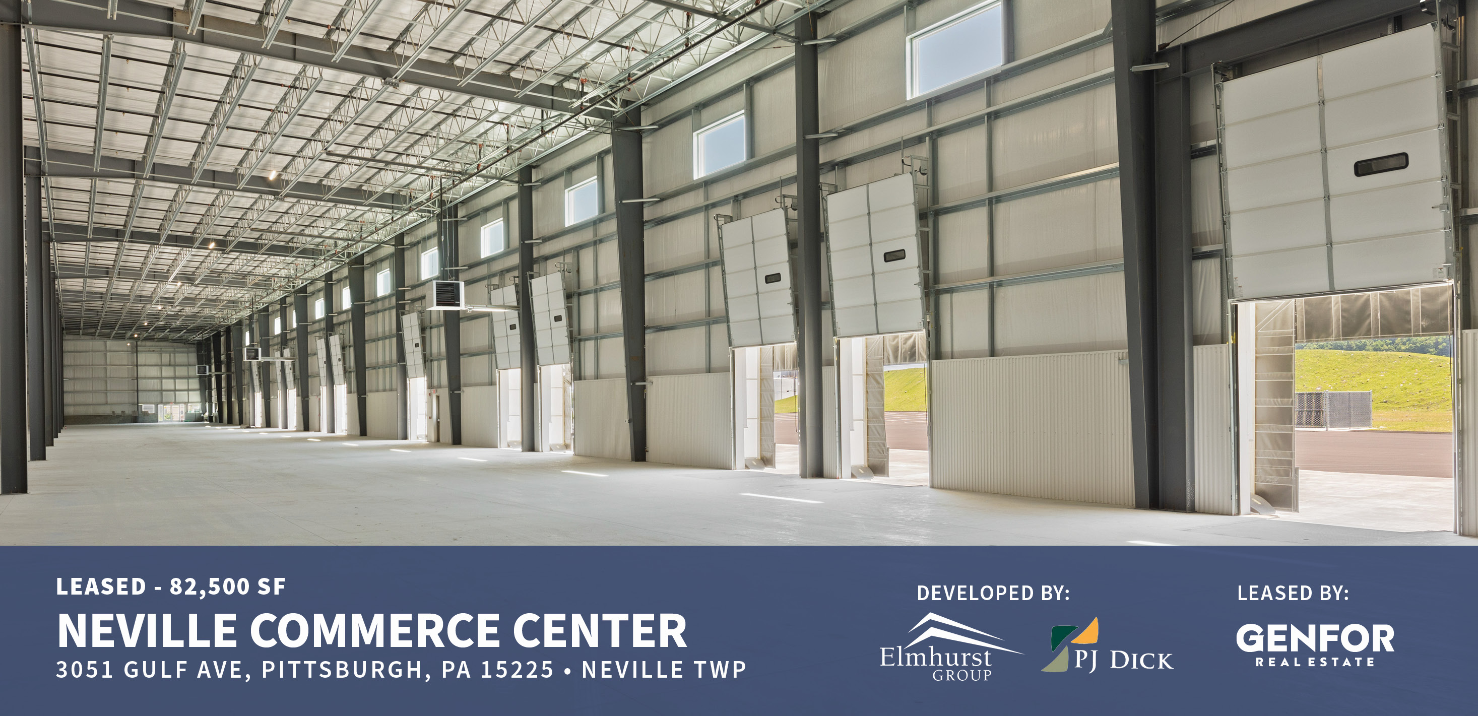 Elmhurst and PJ Dick developed Neville Commerce Center as a speculative construction project. The 82,500 SF Class A industrial building features 30' clear height and modern column spacing. The building is centrally located with excellent highway access.