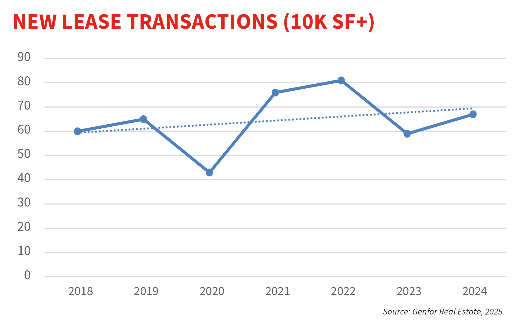 - The 2024 downturn—marked by a 28% drop in volume versus the prior six-year average—was primarily due to a reduction in leases above 75,000 SF.