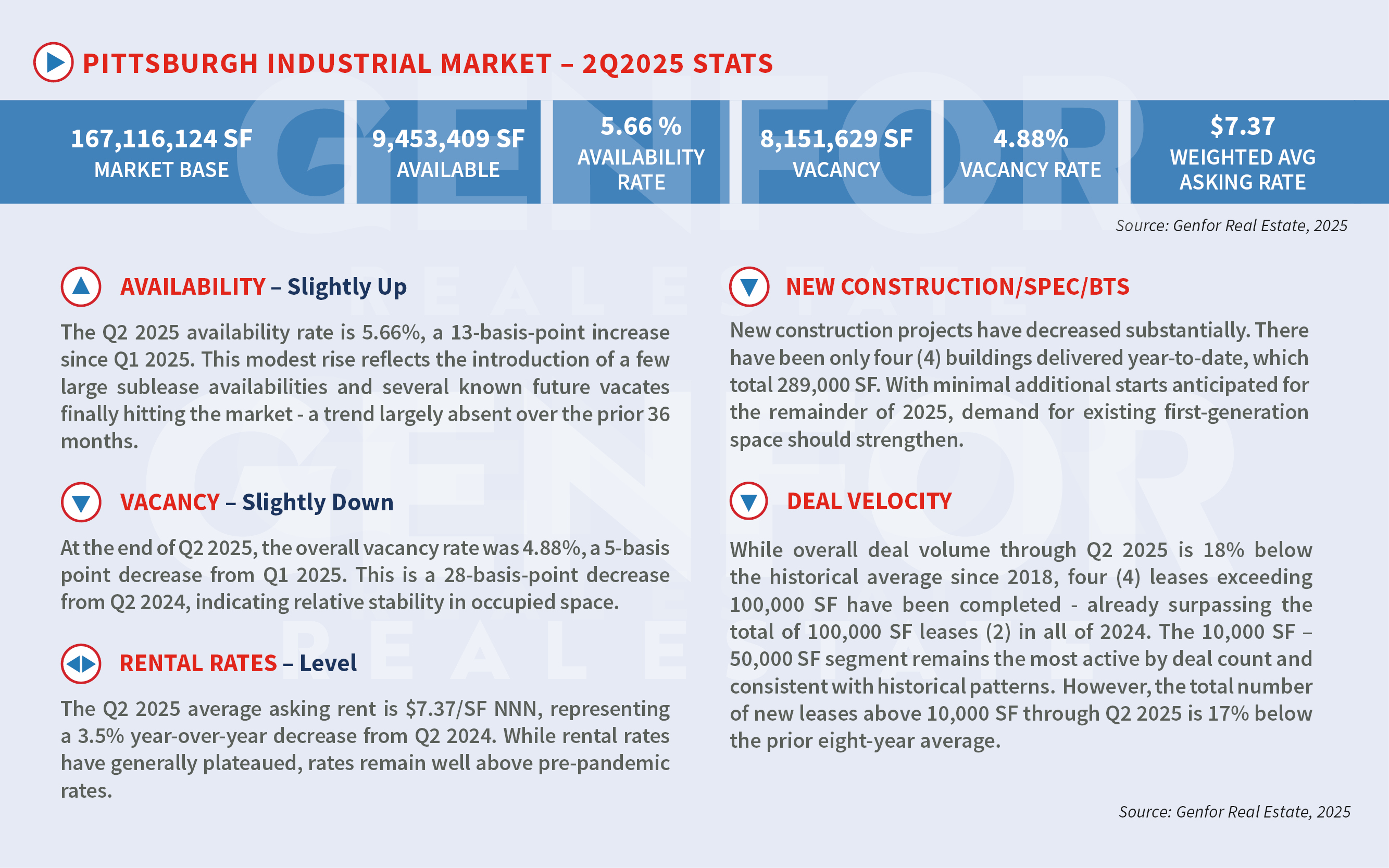 Following a subdued period of transaction activity from 2023 through 2024, early 2025 opened with a very strong start in January. However, this strong start slowed as macroeconomic & policy uncertainty had a chilling effect on leasing activity starting in Q1 2025 as tenants exhibited caution. This trend is not unique to Pittsburgh as the national industrial vacancy rate is increasing, the national net absorption rate has decreased, and over 70% of industrial markets in the US are experiencing higher availability rates.What is unique to Pittsburgh is several recent events and trends that will have a very positive impact on our regional economy and local industrial market. Those include: