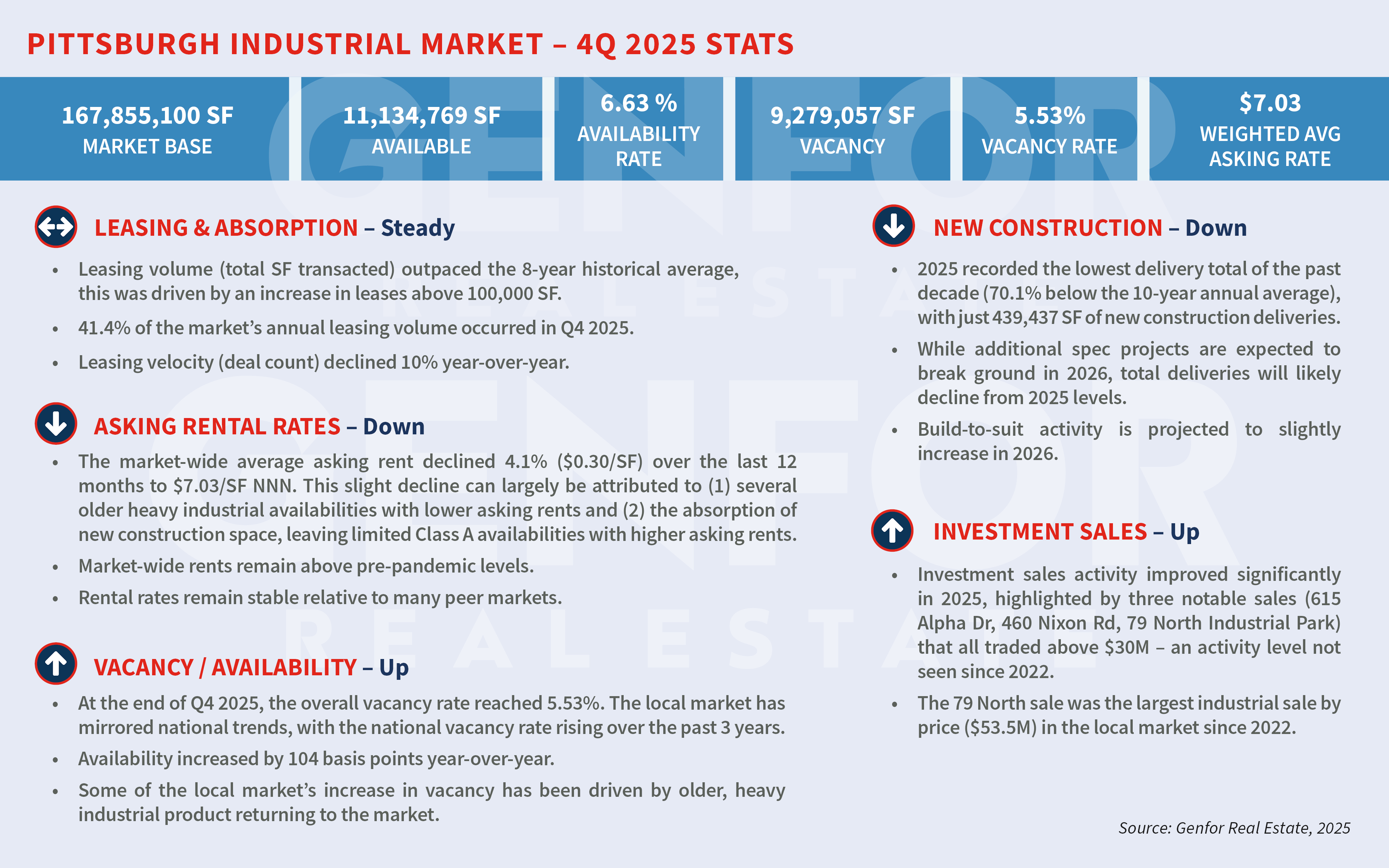 Entering 2026, Pittsburgh’s industrial real estate fundamentals remain healthy and comparatively well positioned. Ongoing investment across energy, power, manufacturing, and infrastructure-driven industries, combined with limited new construction and improving tenant engagement, creates a foundation for cautious optimism and a more active market in the year ahead.